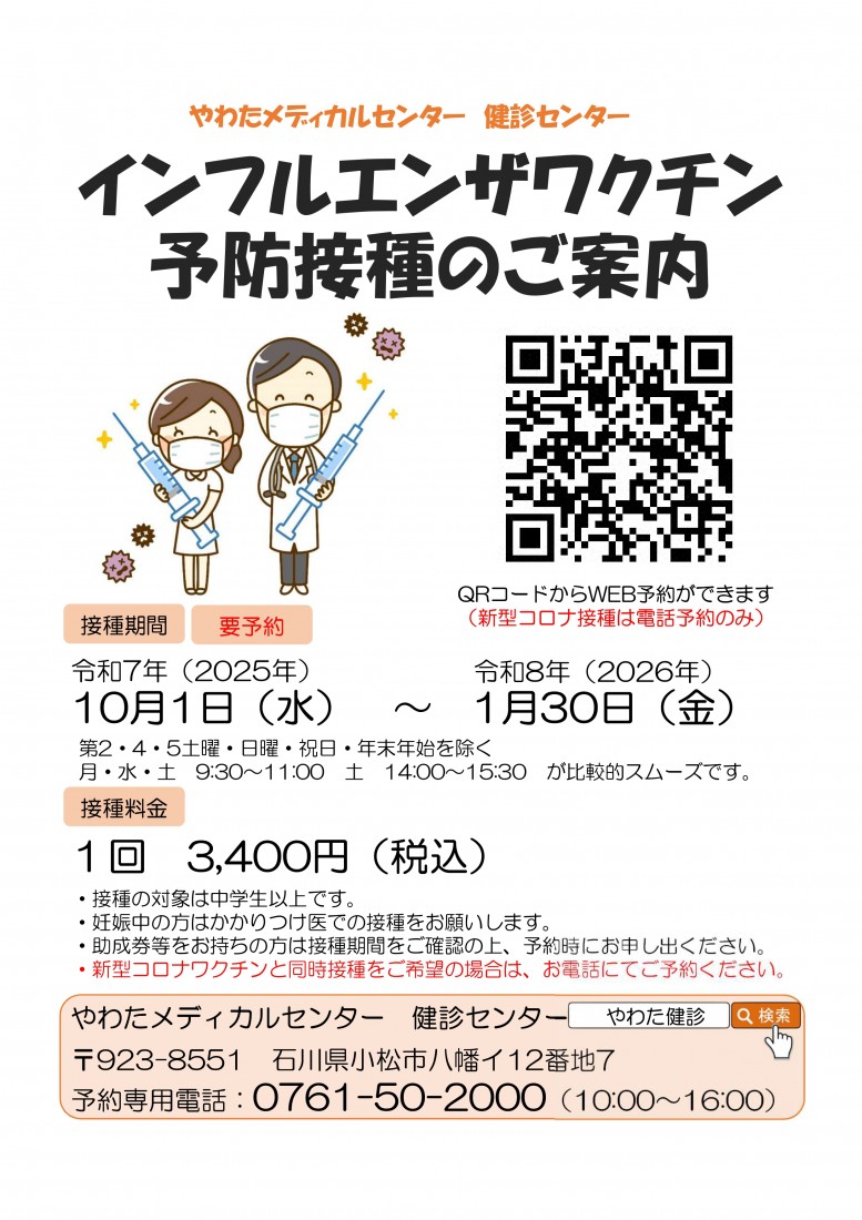 やわたメディカルセンター 健診センターでは、2025年度のインフルエンザ予防接種を開始します。